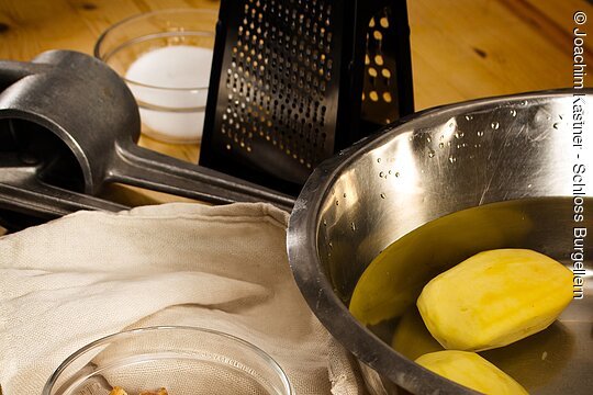 selbst zubereitet. Angefangen vom Kartoffelreiben, Ausdrüggn der Klöß, über Bröggala rösten, bis hin